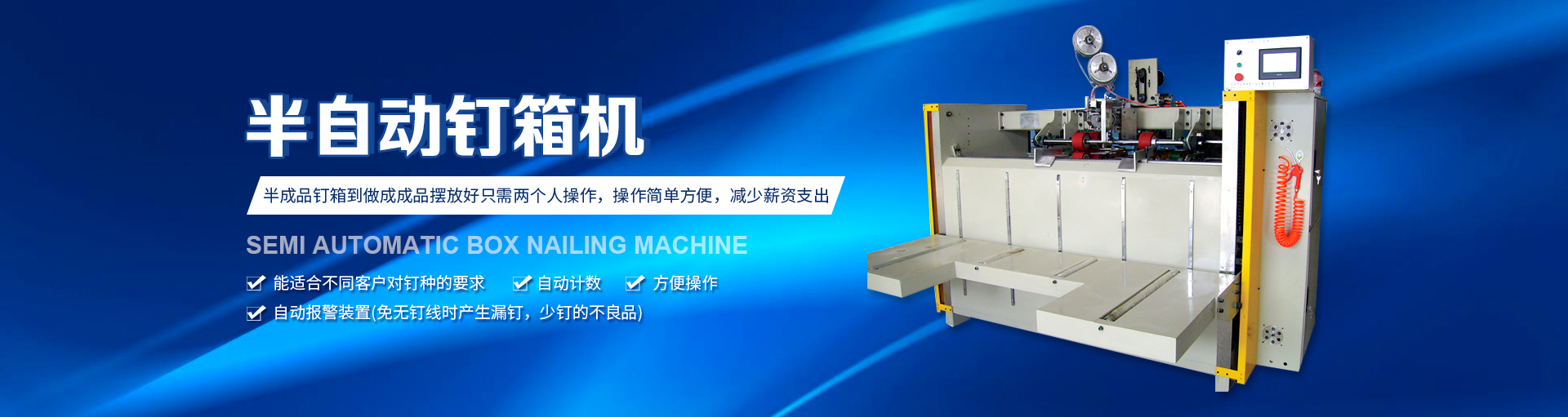 半自動(dòng)釘箱機(jī)設(shè)備特點(diǎn)釘箱機(jī)在現(xiàn)在的機(jī)械行業(yè)內(nèi)使用比較的廣泛,因?yàn)楝F(xiàn)在紙箱包裝機(jī)械的發(fā)展迅速,企業(yè)關(guān)于釘箱機(jī)的要求也越來(lái)越高,而組織制造業(yè)想要使設(shè)備更具競(jìng)爭(zhēng)力,需要關(guān)于半自動(dòng)釘箱機(jī)的...查看詳情+ -